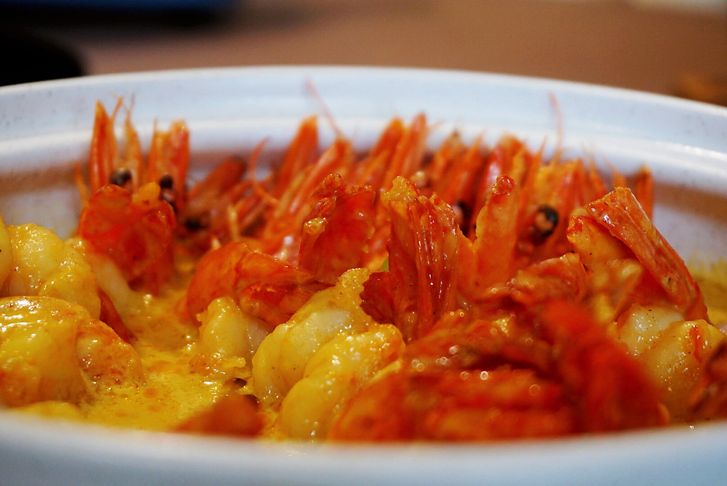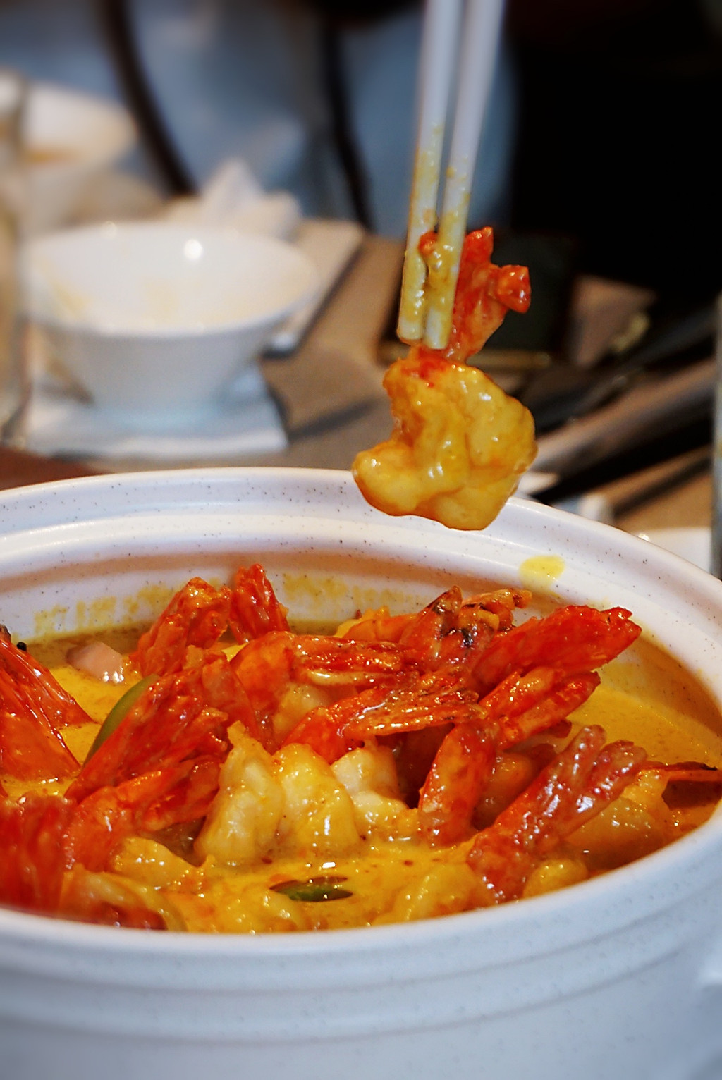 咖喱汁浸草斑节:咖哩色泽金黄,虾肉红润,汁液里有了茶叶的加持,虾肉q弹,咖哩让人回味。而盘底的板栗南瓜,口感绵密香甜,给了小小惊喜。