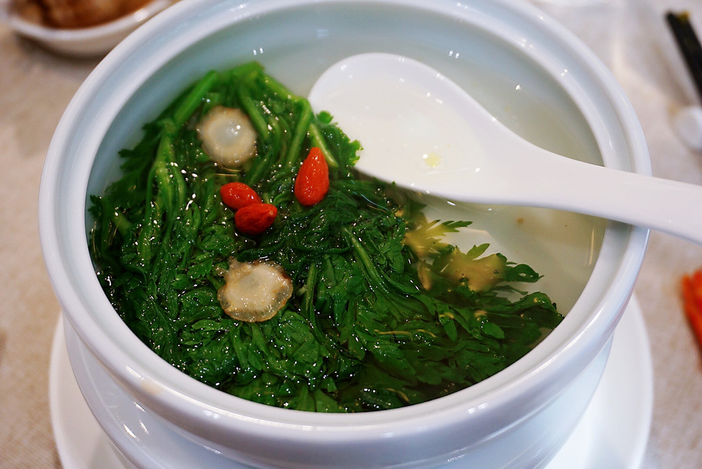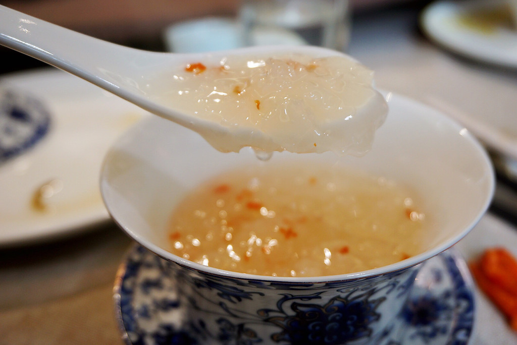 白茶陈皮番鸭炖花胶:茶叶的香味和陈皮的味道散发出让人愉悦的味道来,汤头回味甘甜,茶香陈皮香萦绕口腔中。真正的美容养颜的好汤啊。陈皮理气健脾,花胶富含胶原蛋白,而白茶有着延缓衰老的功效,就连大名顶顶的CHENAL化妆品里也有白茶提取成份呢。