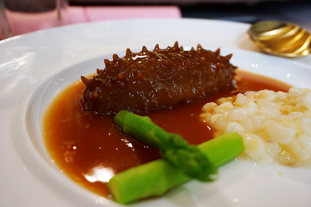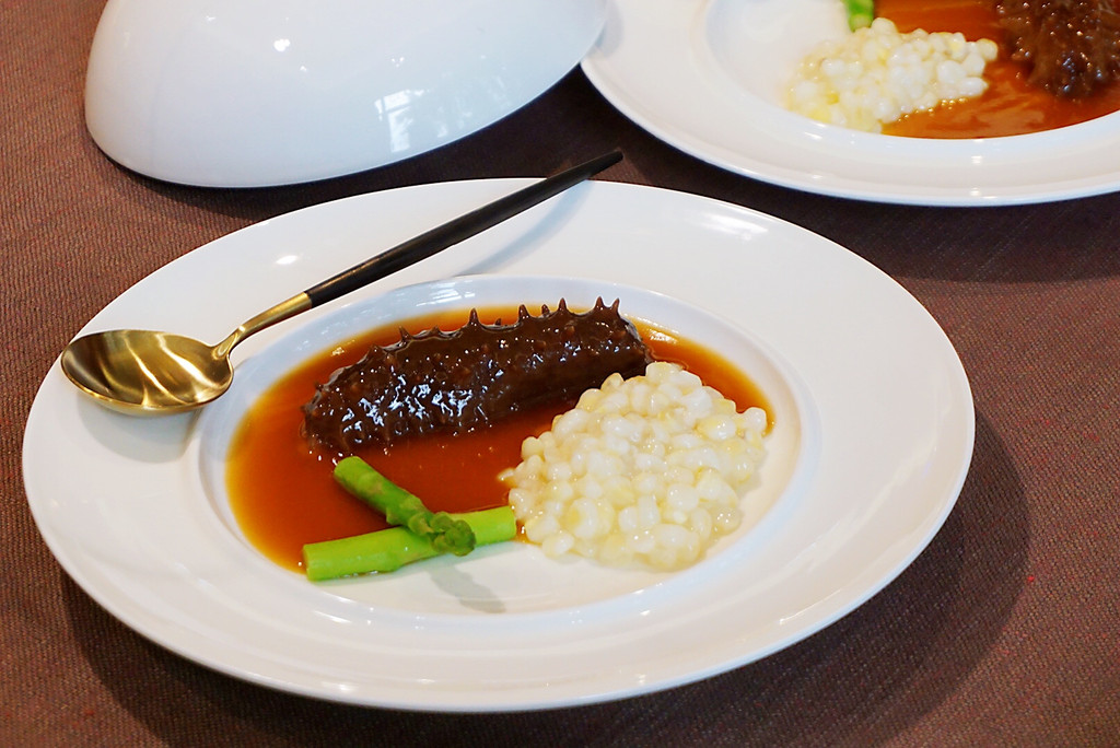 鲍汁粗粮扣关东参:白色的盘盅带着温热,掀开盖,海参搭配玉米胚芦笋点缀。玉米胚软糯,海参脆爽,这招待贵宾的标配,大气高贵。