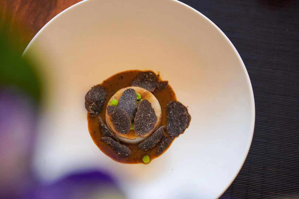 鲜黑松露(也称块菌、主要分布于阿尔卑斯山脉及喜马拉雅山脉的少数地区,是一种生长于地下的野生食用真菌,外表崎岖不平。餐桌上的钻石现代科学研究数据显示黑松露含有丰富的蛋白质、具有极高的营养保健价值。) 黑松露酱 香菇 西芹 鹰嘴豆 甜豆仁。