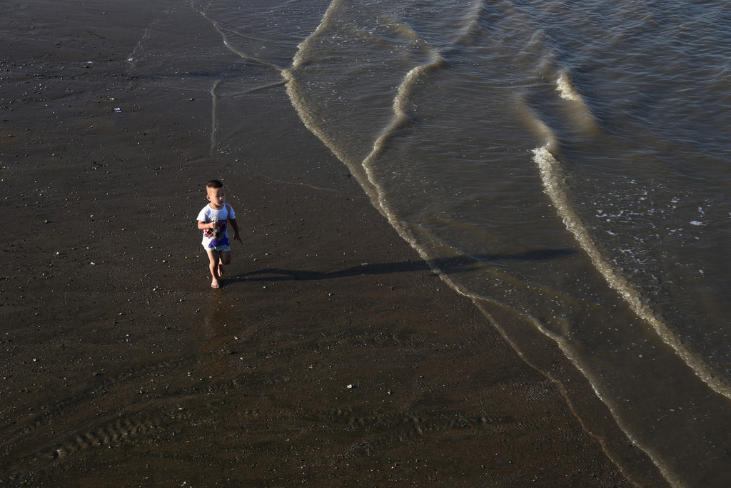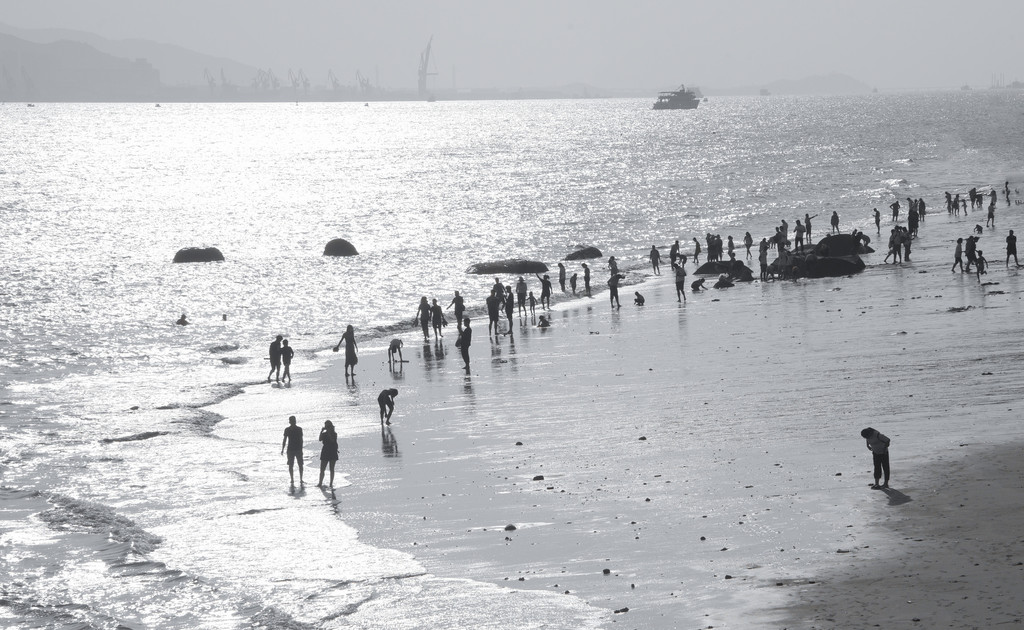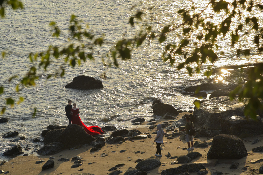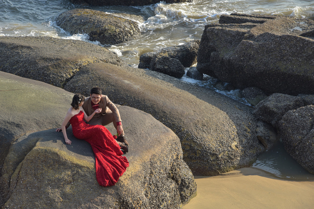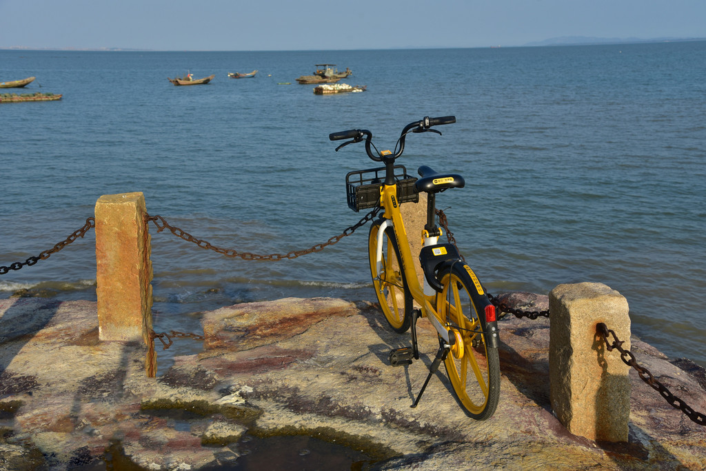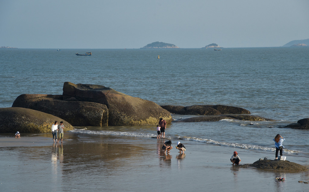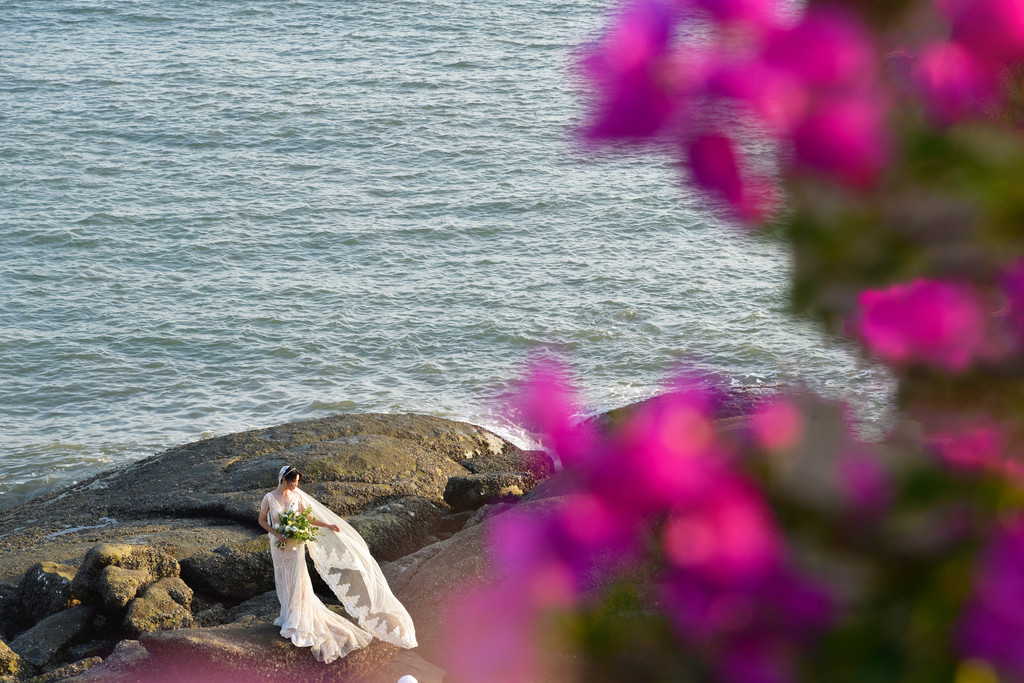 厦门本岛四面皆海,骑行很惬意。避开繁华地段,从厦门国际会展中心附近起步,沿着海边向五缘湾骑行。此段海滨道面朝外海,水域辽阔,海滩绵长,沙滩上时有礁石点缀,豪放中见婉约,景观不单调。有准新郎新娘在海边情定终身,婚纱铺礁石,四目含深情,涌浪在他们四周轻吟低唱,温馨缠绵。