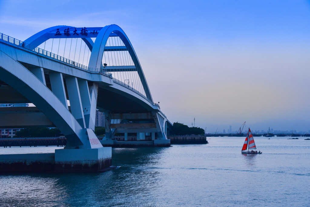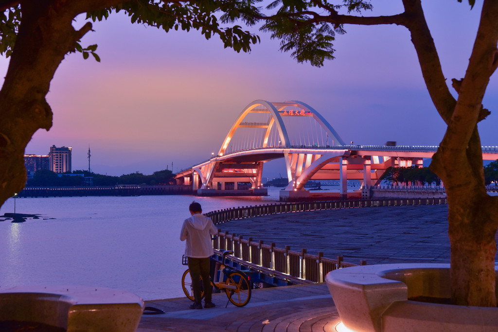继续前行,直奔五缘湾。海湾很安静,水面上风帆桅杆林立,五缘湾是风帆运动的家。若遇上千帆起航出海的场景,一定壮观。环顾四周,罕有人影,国庆黄金周的喧闹,与五缘湾无缘。遇见一个独钓翁,看情形,极少鱼获,不知是在钓鱼,还是安享宁静。华灯初上,五缘大桥金黄色的优美身影飞越五缘湾入海口,美得让人心醉。