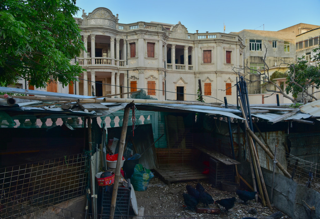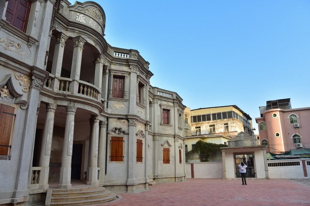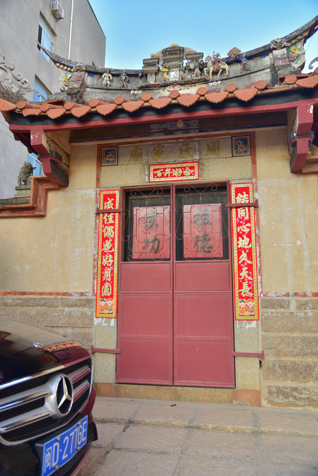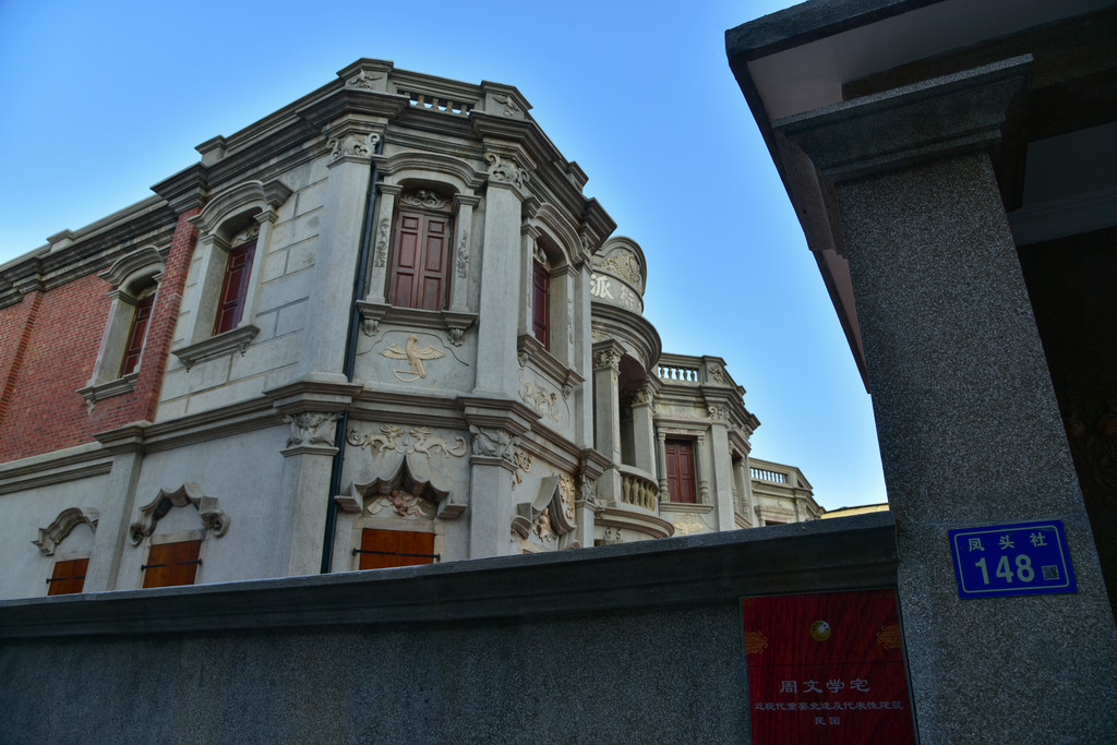前行不远,在一条支巷内看到一幢与周围建筑风格迥异的西式两层大宅,外有一人多高围墙,大门紧闭。墙上有牌,大字写着“周文学宅”,小字说明“近现代重要史迹及代表性建筑 民国”。刚见过古风古韵的周氏家庙,又遇见周文学建于上世纪三十年代的西洋豪宅,看来这个叫凤头社的地方是周家的风水宝地。这些中西合璧的洋楼多见于闽南,大多是闯南洋的华侨所建,当地人也称其为“番仔楼”。有趣的是围墙外竟然搭建了一个鸡窝,若想入内细看,可从鸡窝旁翻墙而入。眼光越过鸡窝往里看,屋顶处横额上有“汝南衍派”四个大字。三国时期的周瑜和北宋大儒周敦颐都出自汝南周氏,这里的周家是他们的后裔?显赫贵族与鸡窝相邻,反差虽大,却也有趣。