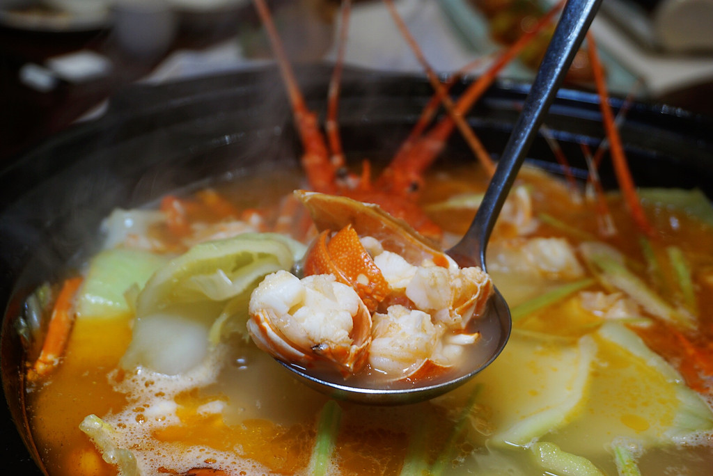 招牌龙虾芥菜锅:霜打过的芥菜清甜绵密,与龙虾一起煮汤带着几分创意,热气腾腾的口感特别鲜甜,边加热边喝,有位朋友一下喝了8碗,真敬他是条汉子,汤头是用龙虾头和壳熬制,喝完还可以再加汤。
