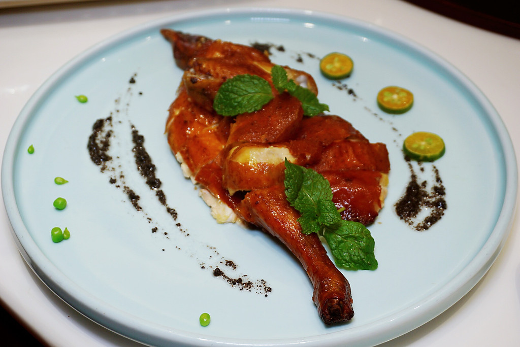 松露脆皮文昌鸡:表皮金黄香酥,鸡肉细嫩,黑松露散发着独特的香气,乘热吃,回味无穷!