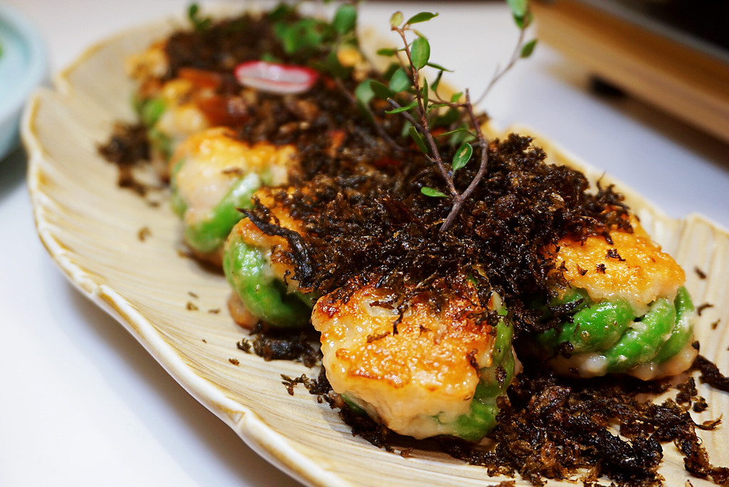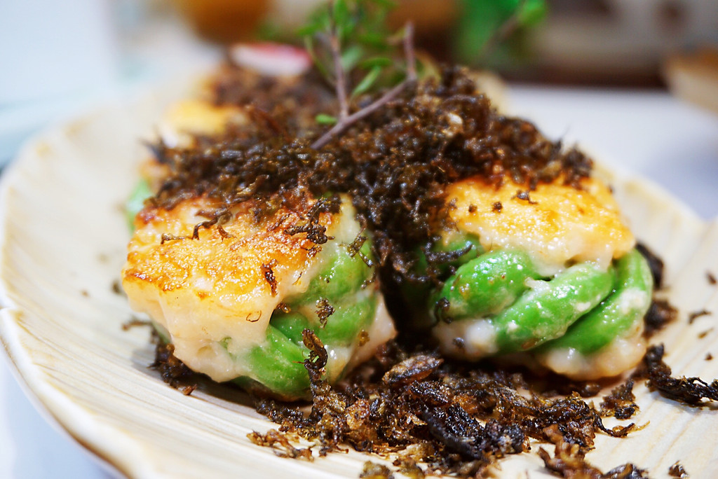 鱼香煎酿豇豆夹:很特别的出品,把长长的缸豆盘成结,再加上虾泥用酿的形式做出,一道用了心思的手工菜,爽脆里带着虾的鲜和榄菜的香。