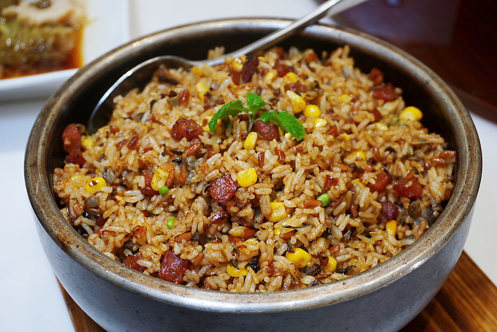 石锅粗粮野米饭:杂粮中加入了腊肉碎,粒粒分明口感Q中带韧劲,满口香气。