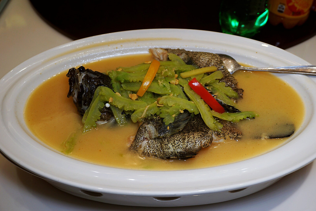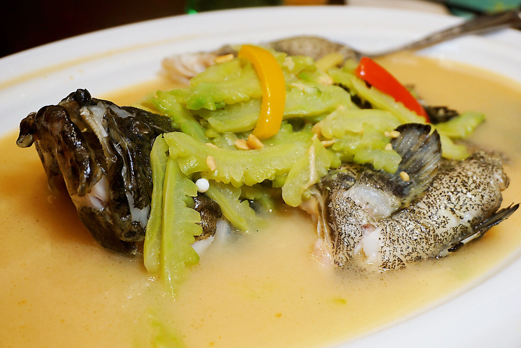 潮式瓜青煮龙胆:苦瓜煮龙胆也是挺特别的,龙胆鱼肉质鲜嫩,苦瓜清爽,这道组合惹味极了。