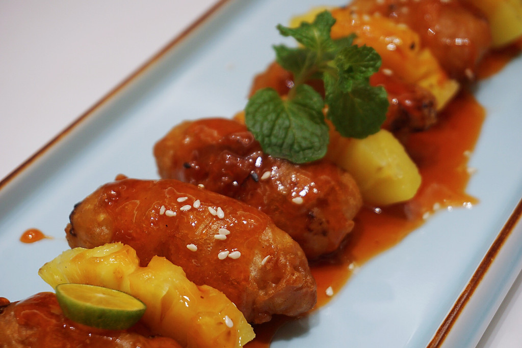 港式新派咕噜肉:和凤梨摆成一排很有食欲,酸甜爽口,最奇妙的是咕噜肉居然有菌菇内馅,果然新派!