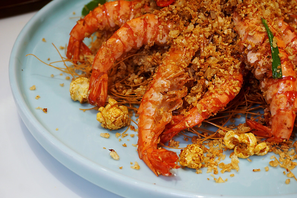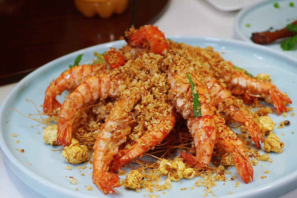 避风塘深海明虾:虾的个头硕大,红彤彤的,避风塘的蒜末和面包糠香气浓郁,虾肉质饱满弹牙,鲜香美味,好满足。