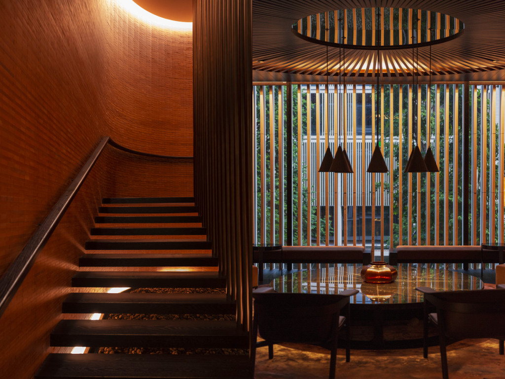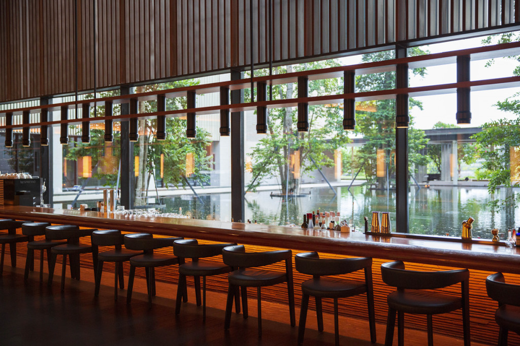 长长的吧台既是前台也是酒吧,宽敞的大厅空间会随着光线的变化自动调节灯光,墙上是画家卢甫圣以20位圣人为灵感创作的“山水意境”人物肖像作品。