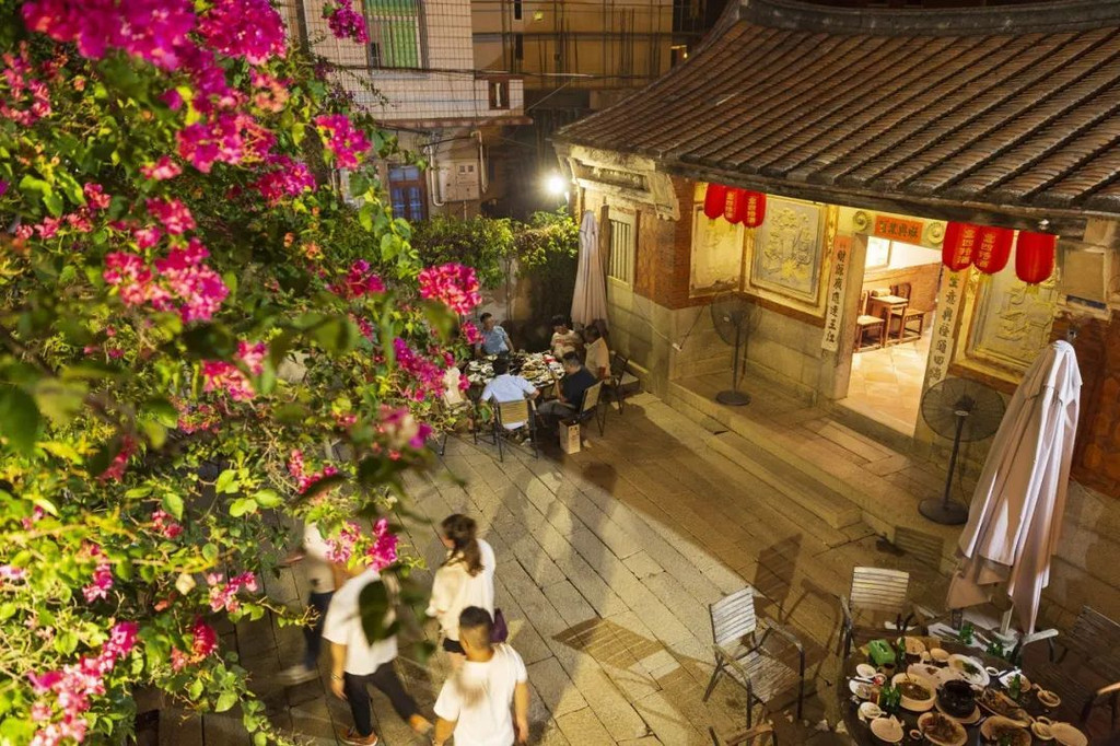 据说为了修整这座古厝,它的主人用了一年多的时间,才让这座百年闽南燕尾式建筑焕发了生机。走进古宅的大门,是一进院落,院中有园,树下的几桌本地客人正享受着美食。我们的包房在二楼,站在阳台上俯瞰整个院落,本地人鲜活的生活氛围便在眼前。
