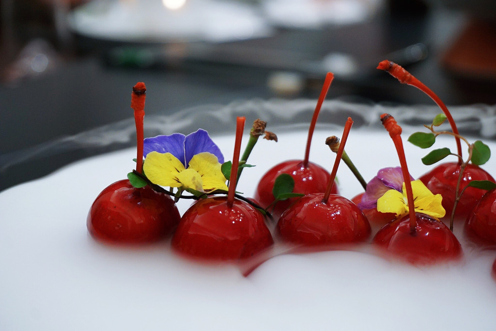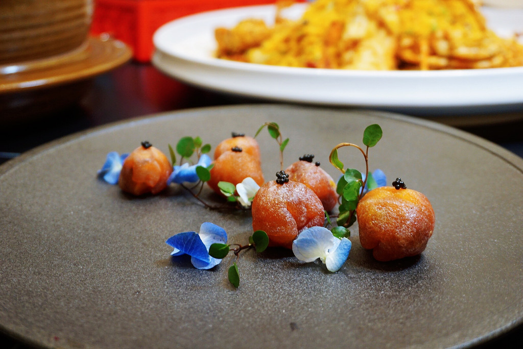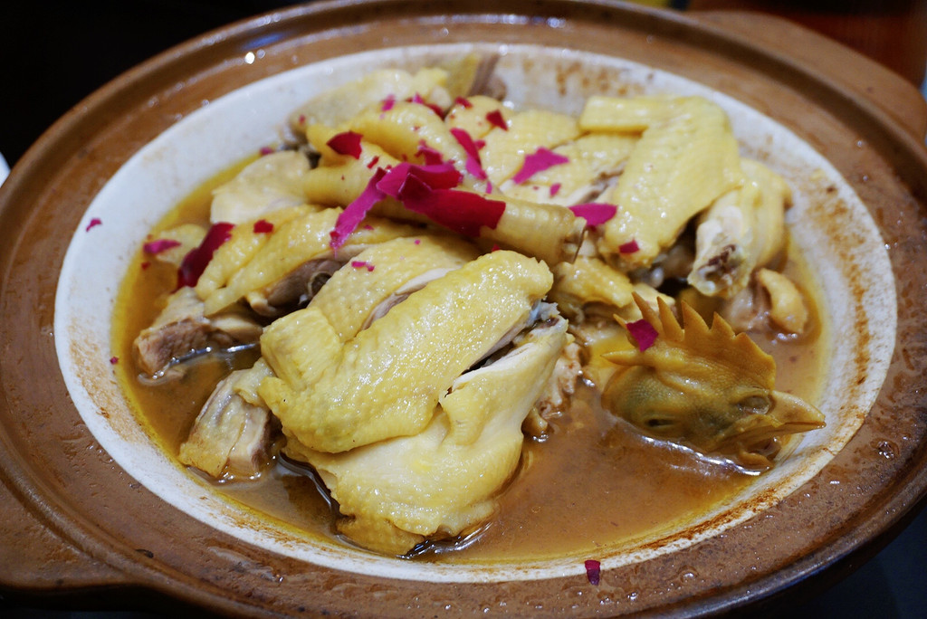 玫瑰香河田鸡:仪式感满满的一道菜,河田鸡在烟雾缭绕中上桌,服务员像变戏法一样变出一支液氮玫瑰,选冰客中一位女性来拍打玫瑰,玫瑰花瓣碎落在菜品上,期间服务员还送上三句祝福:一拍喜从天降,二拍财源广进,三拍鸿运当头。这道客家盐酒鸡皮脆肉嫩带着浓浓的米酒香气。这道真是美味与颜值共享。