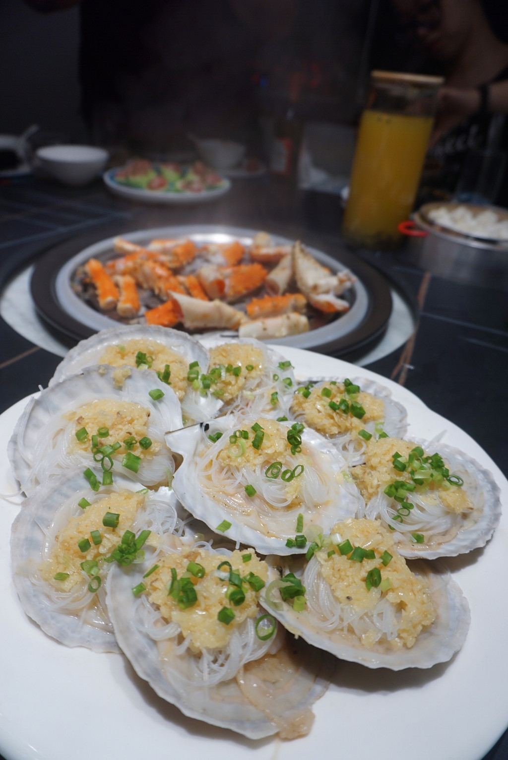 当然还有新鲜的小海鲜拼盘、丝瓜蒸肉泥、黑椒牛肉粒和粉丝扇贝,当然还有主食啦。