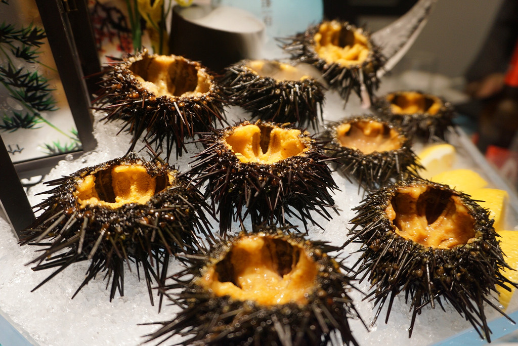 马粪海胆:海胆即可生吃也可以蒸着吃,生着吃YYDS,挤点柠檬汁,直接用勺送入口中,一点不会腥,嫩滑鲜美,大海的味道你试一下就知道。