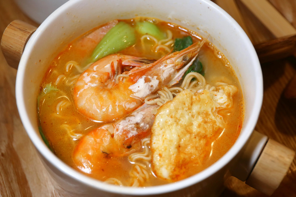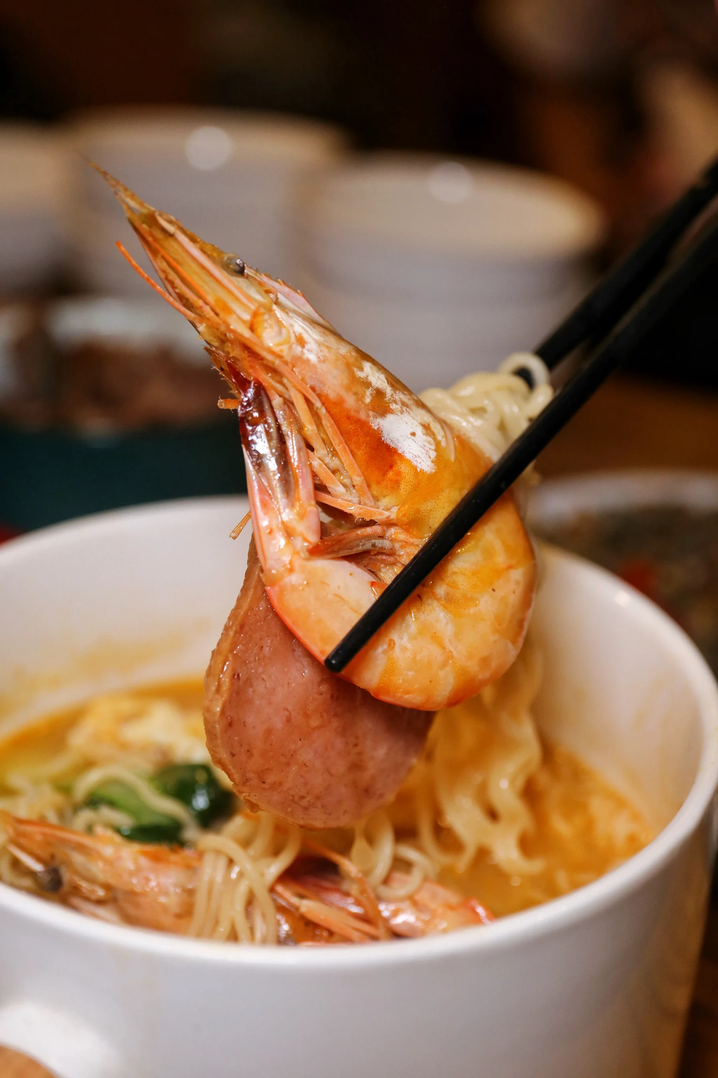 人多的话,也可以再点上野生大虾泡面。一碗里足足放了两只大虾,汤头融进了虾肉的鲜美,佐上煎蛋和午餐肉,简单的幸福感就是来得这么简单。
