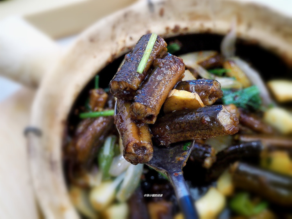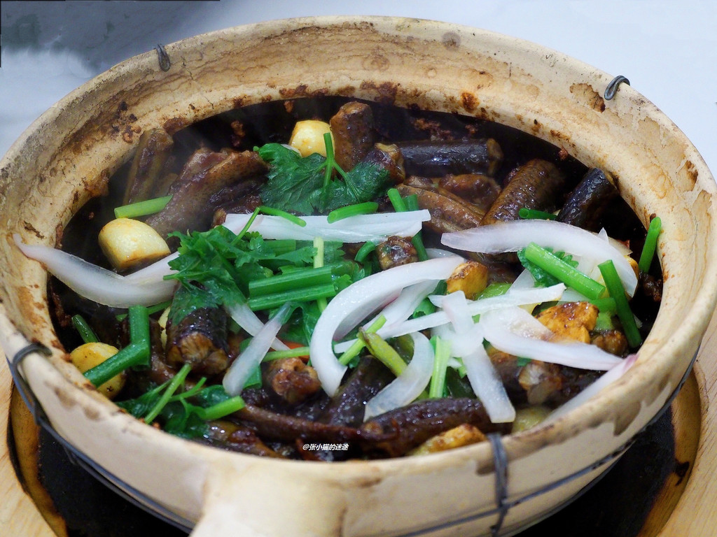 啫啫黄鳝煲,精选这种男士无名指粗细的带生血黄鳝段,在温度极高的砂锅中与秘制酱汁、蒜瓣、姜片等一起翻拌,口感鲜美,还有补血功效。
