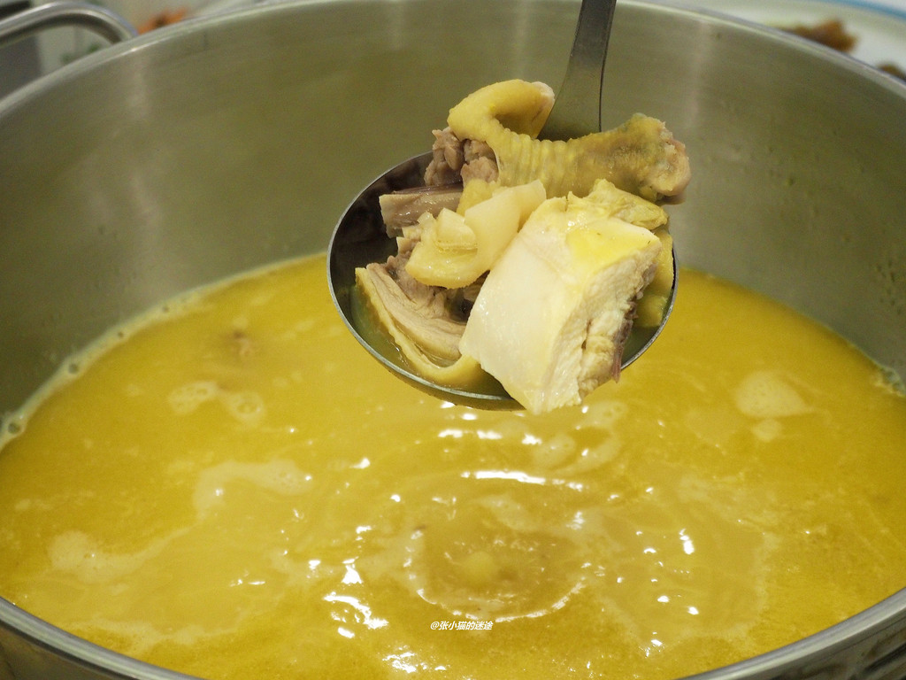 港式花胶鸡,清远鸡和花胶下锅滚煮十五分钟,一大锅融合了鸡肉和花胶精华的金灿灿汤汁,入口醇香浓滑,连喝几碗才过瘾。
