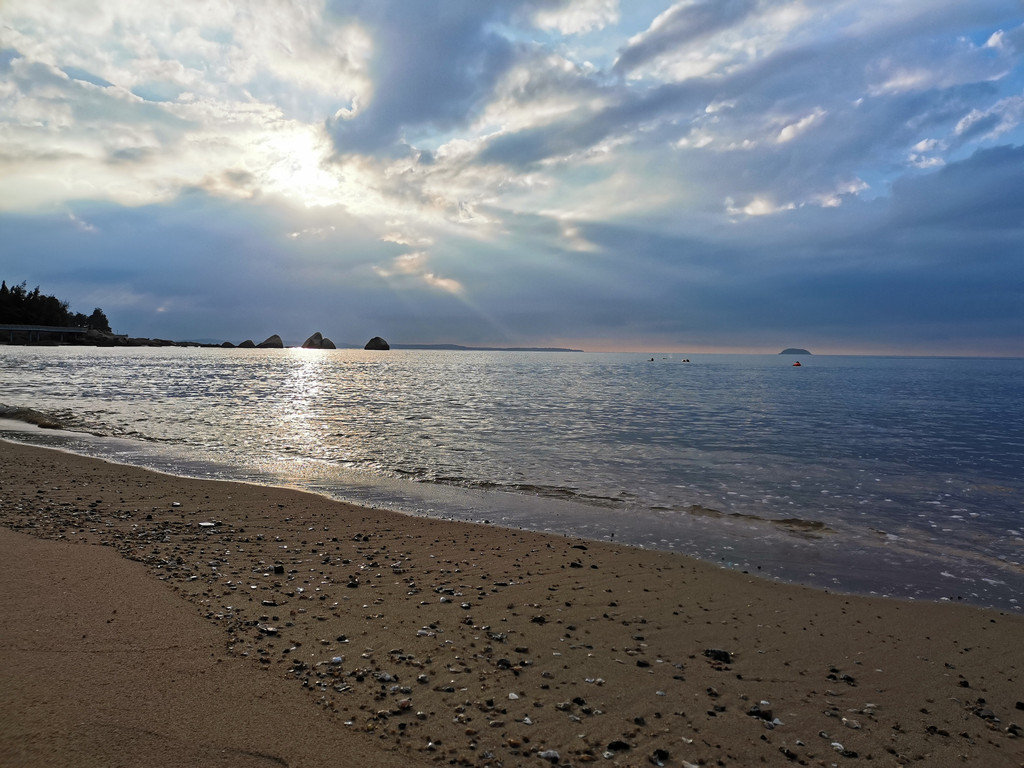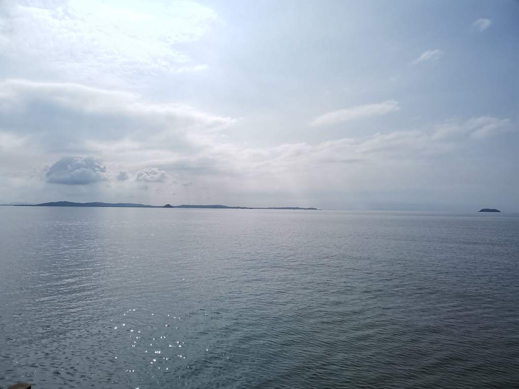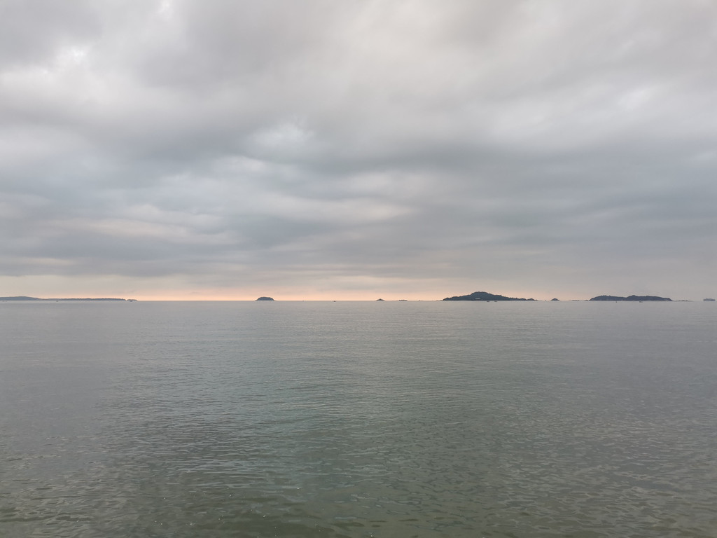 遥远的天际出现了一点鱼肚白,遗憾的是,因为天气缘故,大火球并没有缓缓升起在海平线上。云层遮住了朝晖,天空一半灰白,一半湛蓝,云后的太阳轮廓依稀可见。近海面上飘着零星几叶小舟,朝雾隐隐约约,粼光闪烁,早起的人们已经开始干活了。