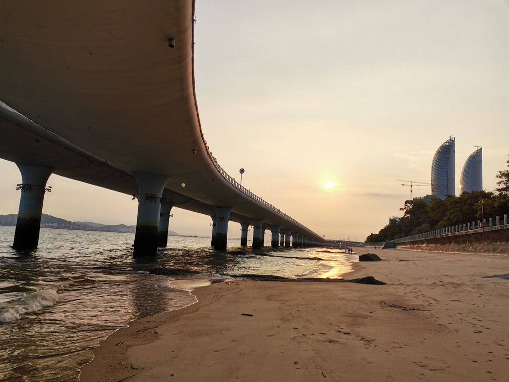 白城沙滩的位置可谓得天独厚。车来车往的大学路对面,是充满人文气息的厦大校园。步行去南普陀寺也不过十来分钟路程。百米开外矗立着厦门地标双子塔,形似航海中的风帆,已然成为白城沙滩视觉空间里浑然一体的构成元素。演武大桥绕过了双子塔,绕过了沙滩,绕过了厦大,像一条空中巨蛇,呼啸而来,绝尘而去。
