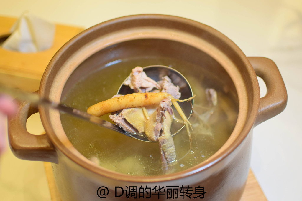 鲜人参炖老鸽汤 | 汤底清澈见底,表层在灯光的照耀下还泛起点点油花,口味清润可口,喝起来顺滑。鸽肉已完全炖软,一口就骨肉分离。