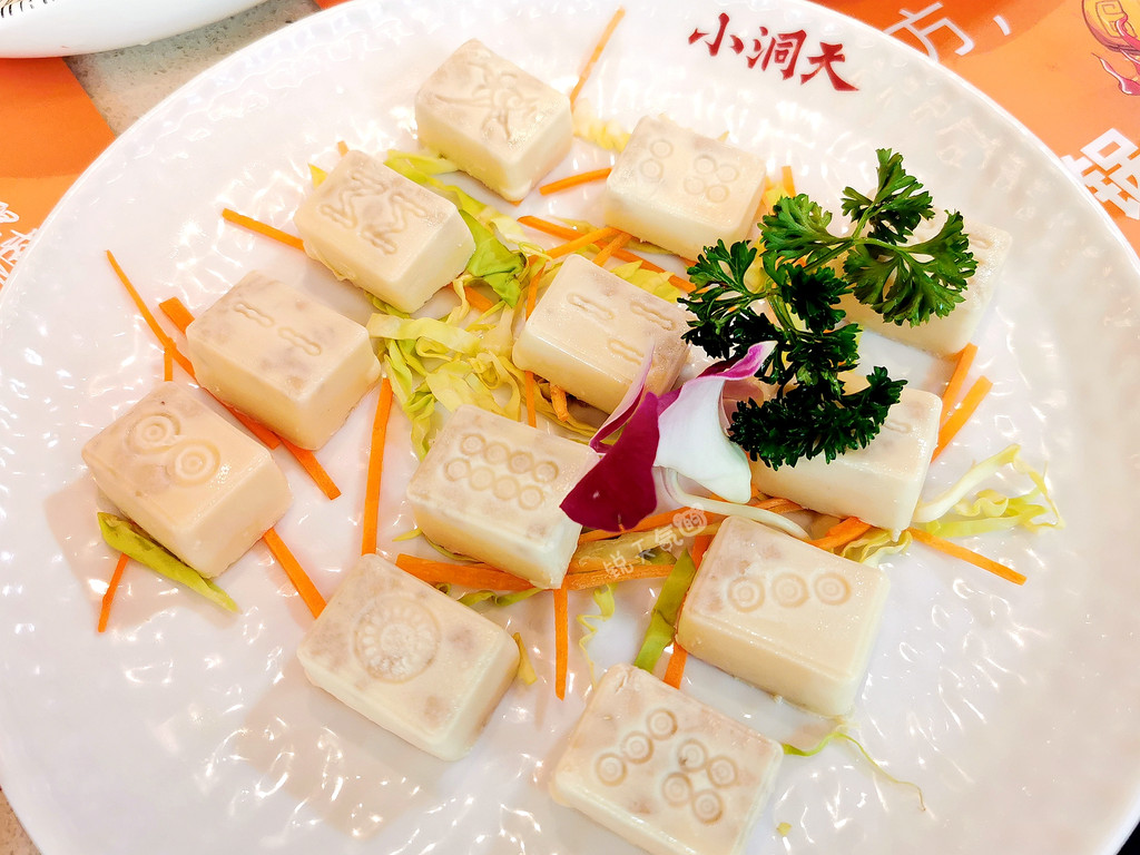 没想到竟然吃到传说中的“鸡豆花”,这是一道流传上百年的川厨看家菜,看着像豆腐,其实是用鸡脯肉茸和熟火腿制成,可谓是“吃鸡不见鸡”、“吃肉不见肉”,明明是荤菜,却清爽如素菜,软嫩如豆花,且鲜美可口。这家重庆小洞天将其创意地做成麻将的模样,更是增添了食趣。