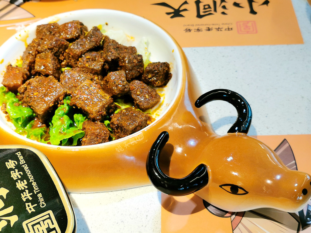 厚实的牛肉粒上,包裹着红红的辣酱,一看就十分有川味,一整盘倒入沸腾的牛油火锅里烫熟,吃到嘴里麻辣够味,松软多汁。