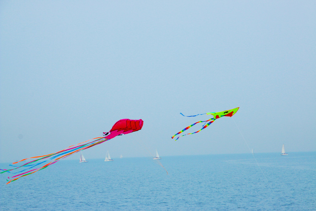 到帆船海,天色已晚,风筝与帆在海风里抱成一团,抖抖抖,沙滩上一堆观众乐成狗。