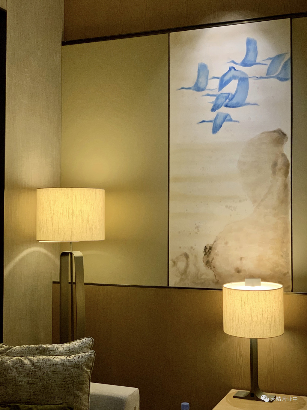 大家有发现马桶间、mini bar、,与这个角落的相似之处吗?蓝色,“是千帆过尽后,海的颜色,是万鸟翱翔后,天的颜色。”选用如此寓意的颜色点缀,亚麻布灯罩搭配暖色光源与温热木质基本色调,使其空间静中有动,居家氛围温馨提升,更显优雅质感呢~