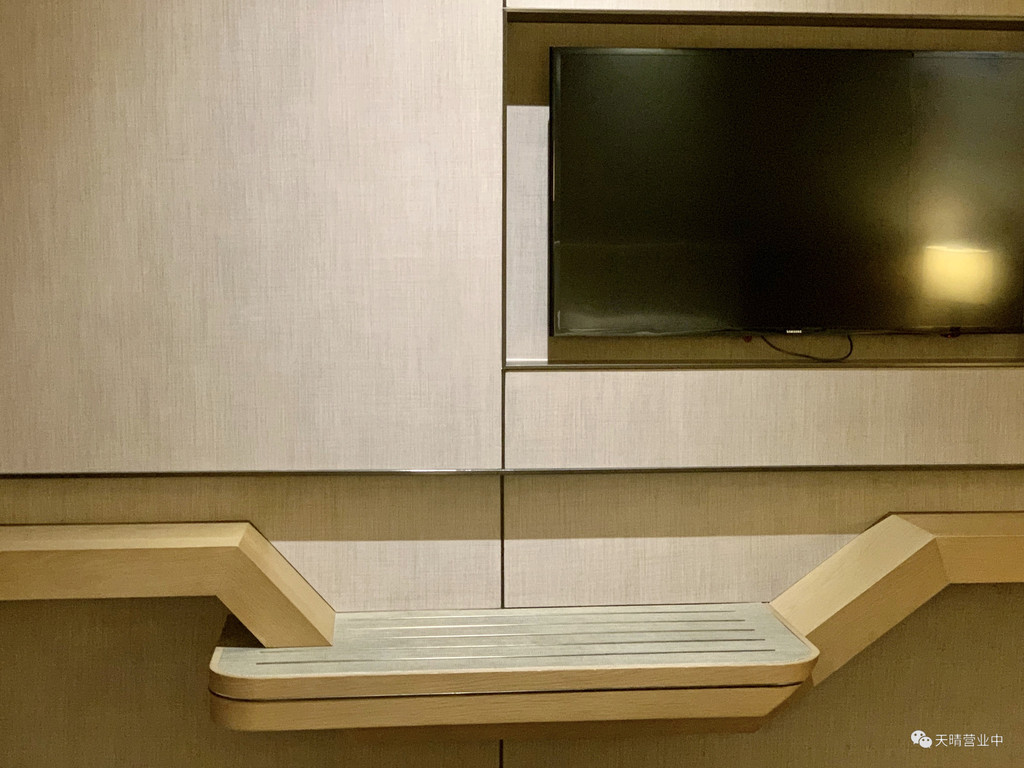 43吋的电视其实没有很大,但是堪用啦。与电视墙一体成型的行李架节省了很多空间、视觉上比较有现代感,大小适合一般登机箱啰~