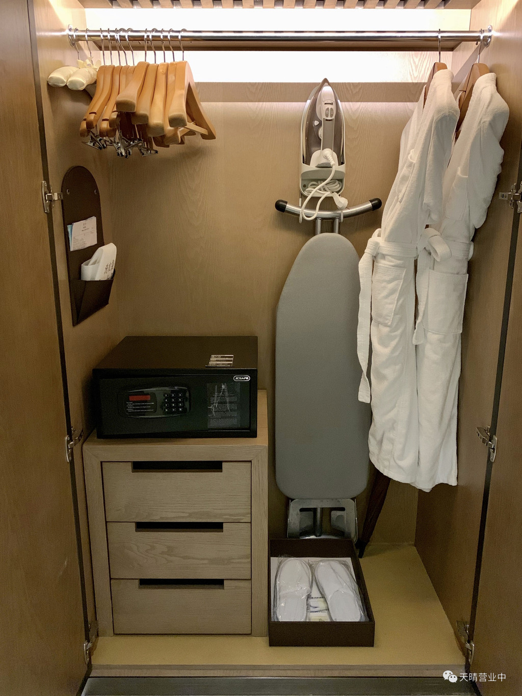 好的,走出卫浴。虽然是标配,但还是附上一张衣柜内容物的照片。抽屉内也有酒店专属的纸袋喔!钻卡的权益原本包括免费洗衣两件,但很遗憾的通知各位,此项福利今年已经收掉~~~ 我个人也只洗过一次啦呜呜呜呜