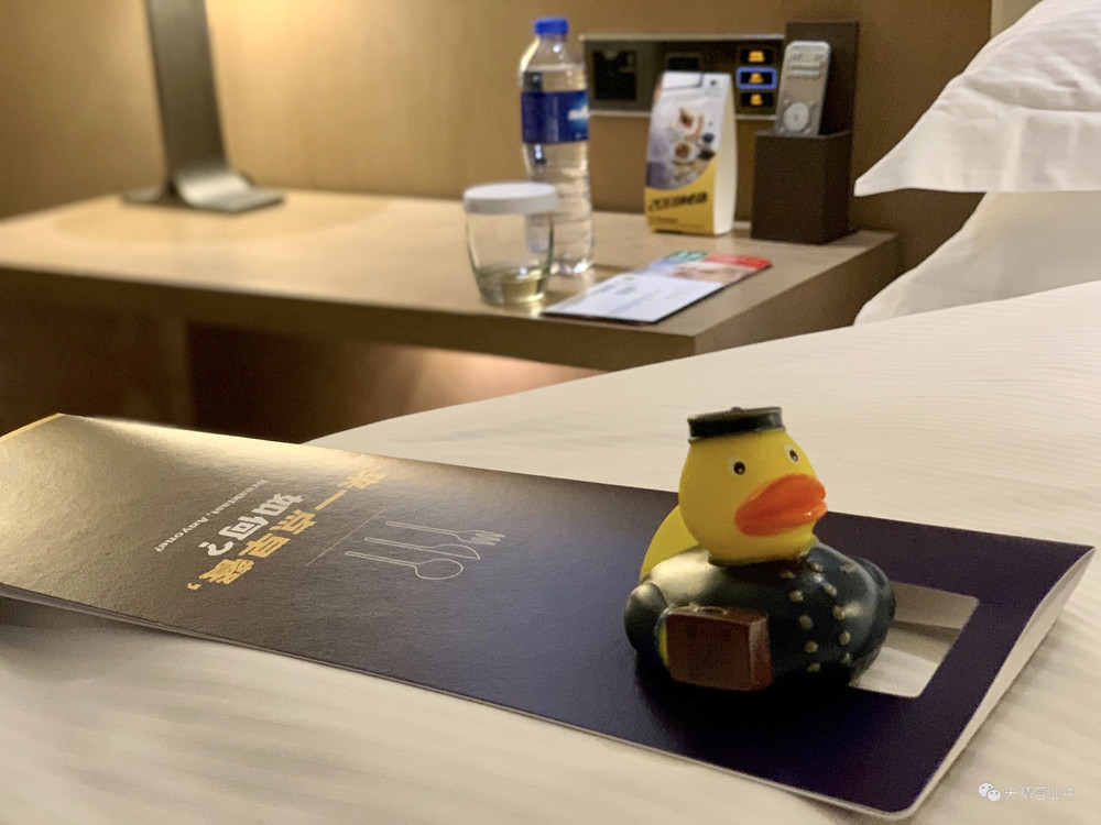 吃完饭才来的,所以夜床已经开好啰~ 海沧一共有四种鸭子(制服公事包小鸭鸭、红色泳衣带泳圈夏装鸭、条纹装吊带裤帅哥鸭、大号裸体鸭鸭),而基本上跟hskp多要一只不是问题,海沧蛮大方的~ 不过某些版本货比较少,后来某些也可能只能用购买的方式啰,最常见的应该就是图中此款公事包鸭鸭