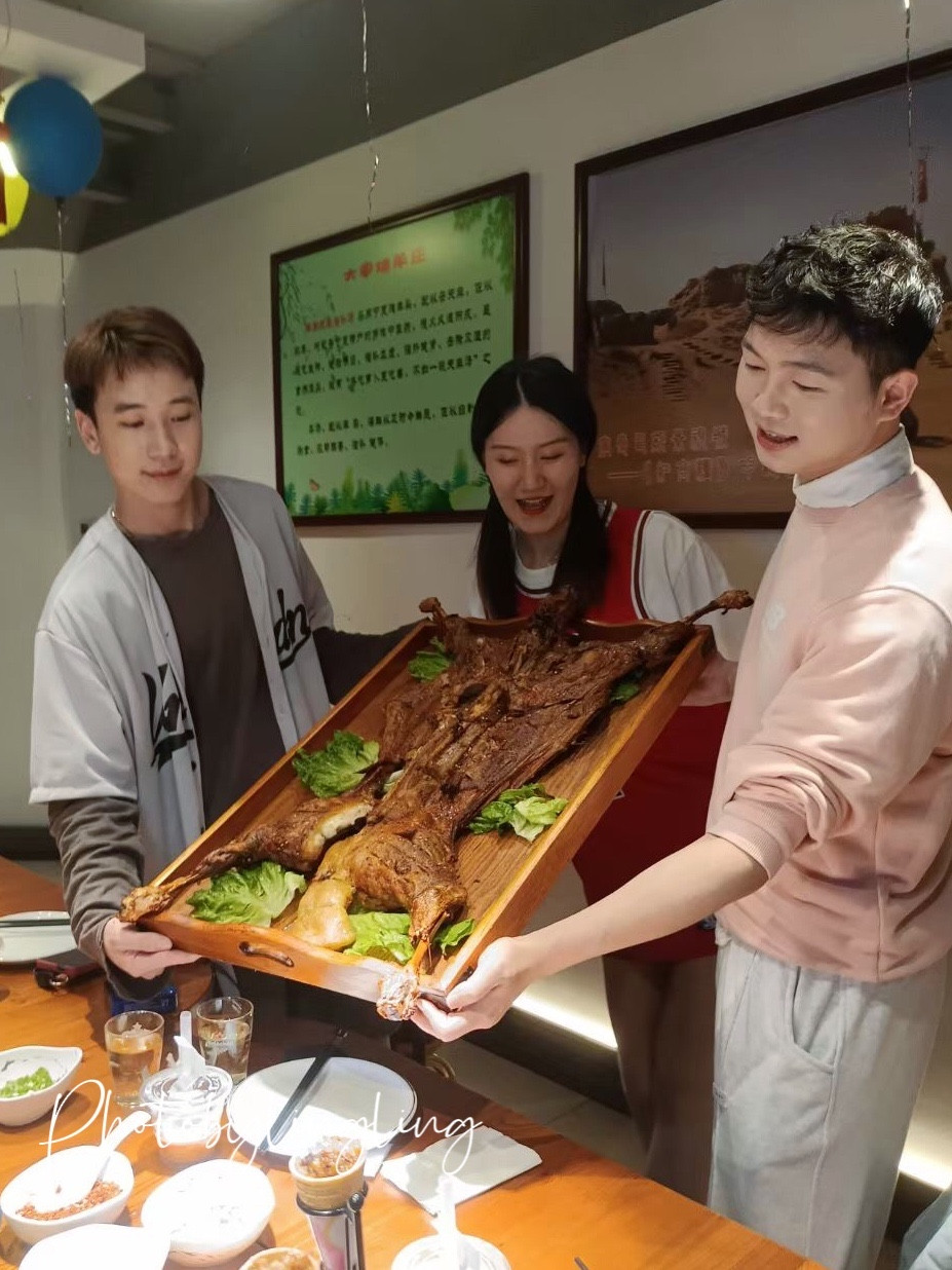 羊瑞堂的烤全羊从烤炉出到餐桌出场极具仪式感,自带喜庆的黄土高原BGM,服务员推着羊车到桌前。整只羊外表被烤得通体金黄,外皮酥香肉很细嫩。果然是专业烹羊30年的技艺了得。