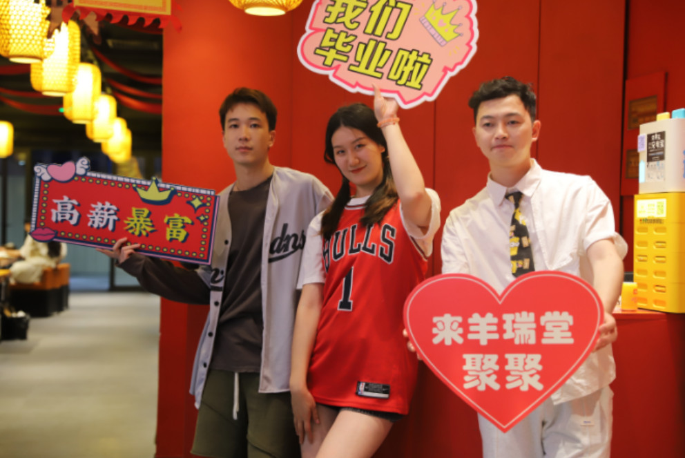 毕业季属于年轻人的聚会,羊瑞堂设置了不少适合毕业季吃羊打卡的小场景,各种KT板物料总有一款适合你打卡。