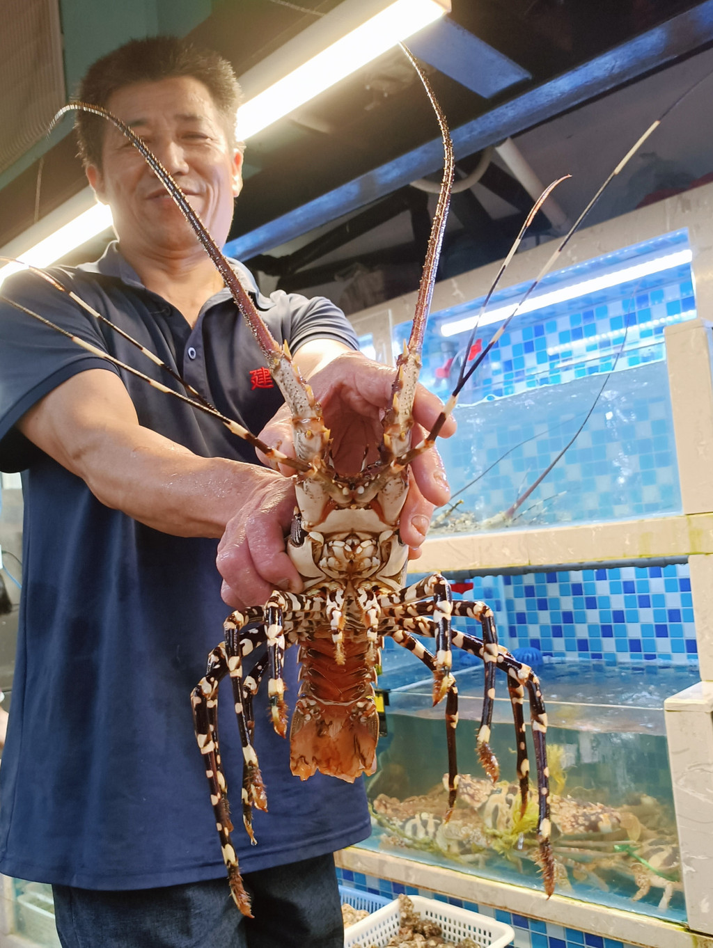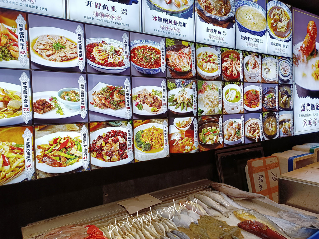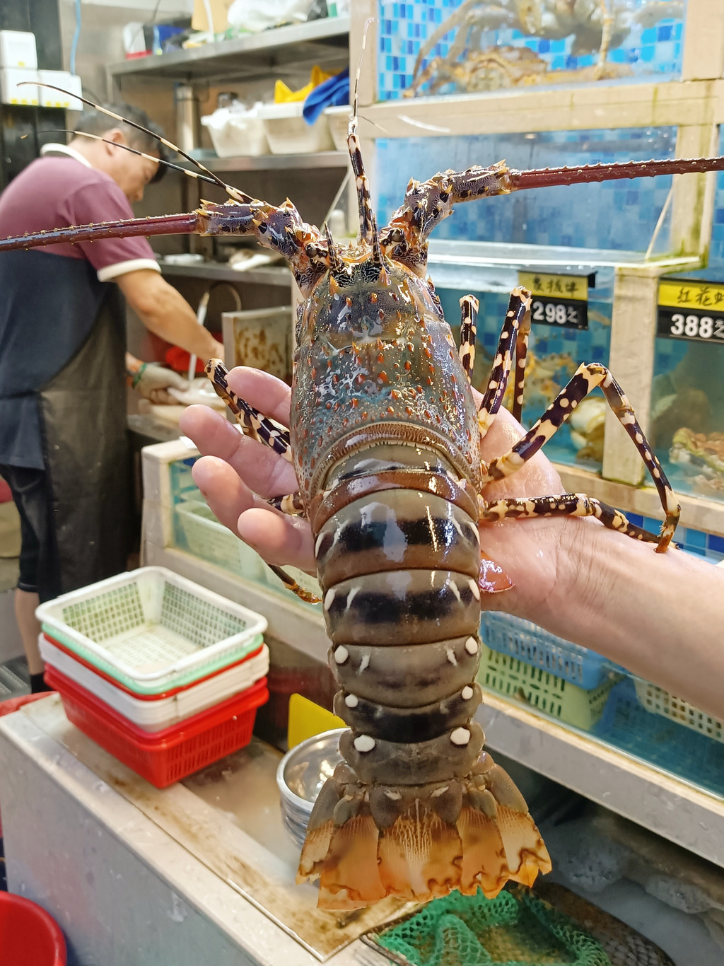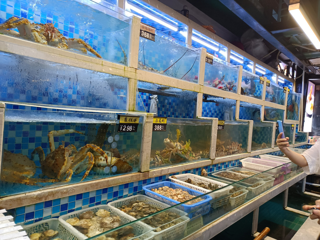 餐厅院子里有一面是大大的海鲜池,各种生猛海鲜,有的悠闲漫游,有的张牙舞爪,各种新鲜看得见。大大的灯牌上明码实价,童叟无欺。