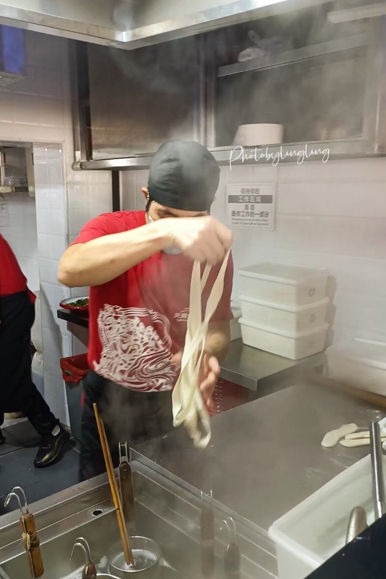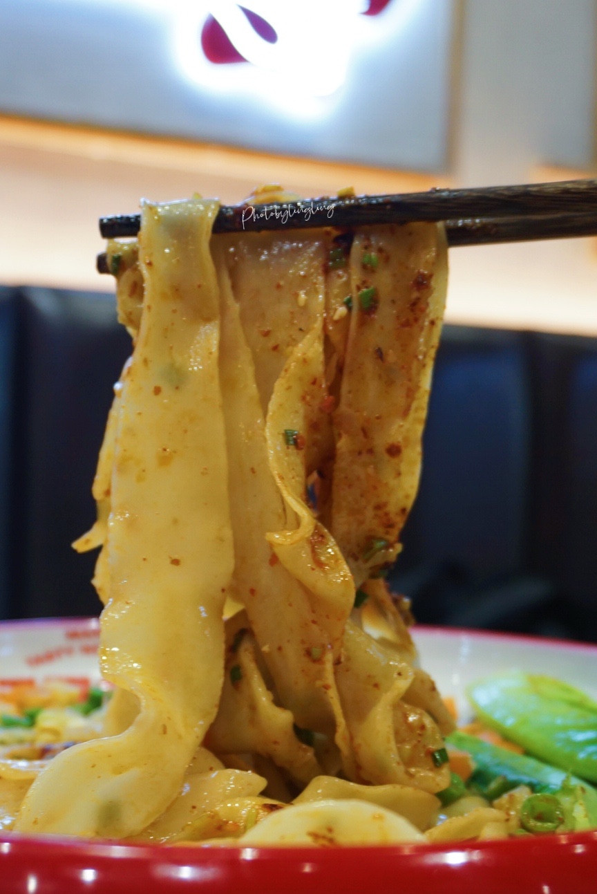 看了一眼菜单,大家速度点了自己喜欢的面食,才坐下一会面就上桌了。油泼面和biangbiang面都是宽面,也是陕西当地人说的裤带面,面宽厚而劲道。师傅在桌上扯着面身biangbiang的拉几下就扔入锅中滚水里煮,面出锅时加入葱花、蒜末、花椒粉和辣椒面,用滚汤的热油浇在下面,再倒放少许酱油和醋。乘热吃,又香又滑又劲道。那叫一个爽。