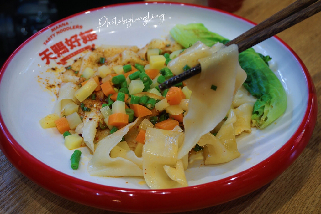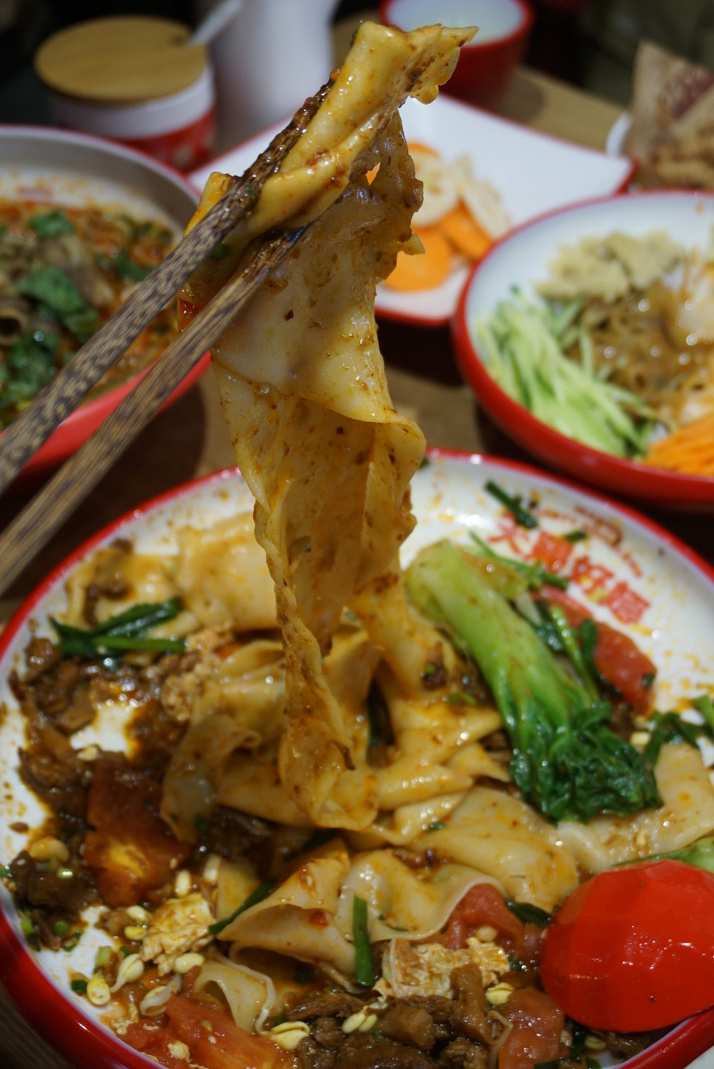 biangbiang面也是扯出来的宽面,面碗里加了番茄鸡蛋,青菜,臊子等,夹起来抖开拌均了,呼噜呼噜几口下去,那吃一个满足。