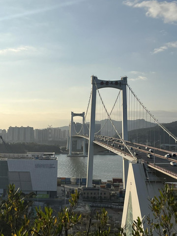 如果想要去看海沧大桥,一定要从那个公园的斜坡走上去,从这个角度上去就能看到大桥了。而且,还能从这里看到摩天轮和港口。好看极了。