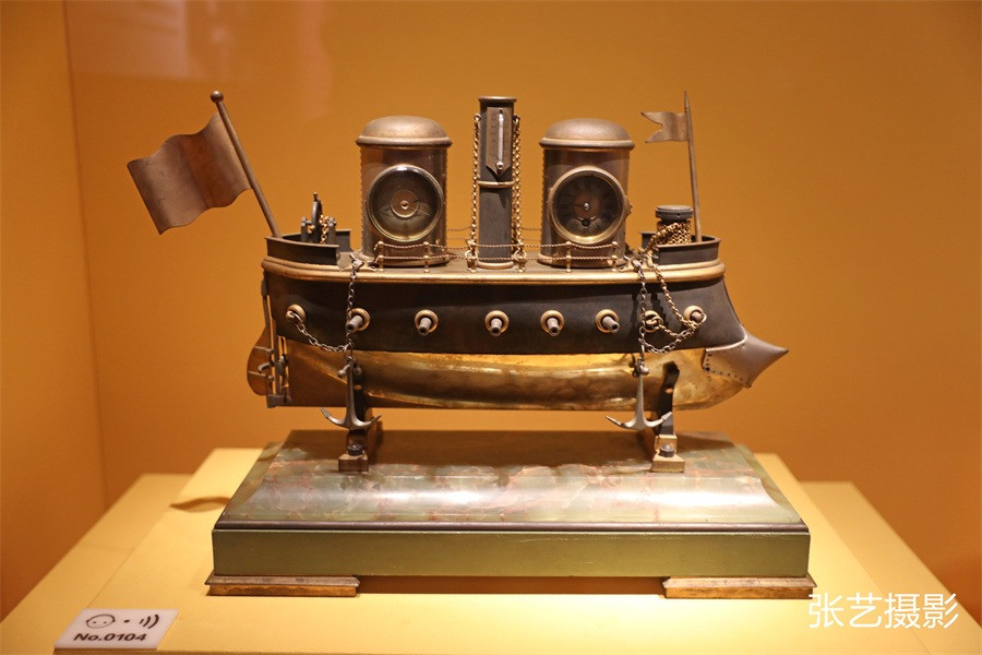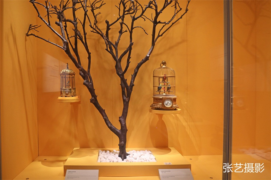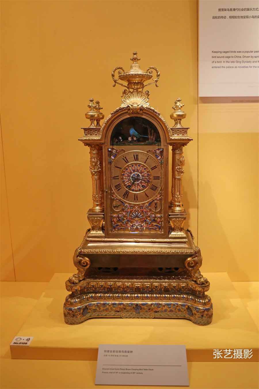 这件展品是清宫旧藏法国19世纪末钟表。船身置于大理石座上,甲板上立两个圆筒,安置了寒暑表,两筒之间的烟筒侧面嵌温度计,顶部放置指南针。此表是瑞士乌利文贸易公司在中国经销的法国产钟表,属于工业模型钟表。19世纪末,西方工业化已经相当成熟,工业模型风行世界,成为家庭中的显要摆设,钟表匠就在工业模型上添加钟表,使两者浑然天成。图为法国 9世纪末或20世纪初的铜镀金嵌珐琅鸟音钟。