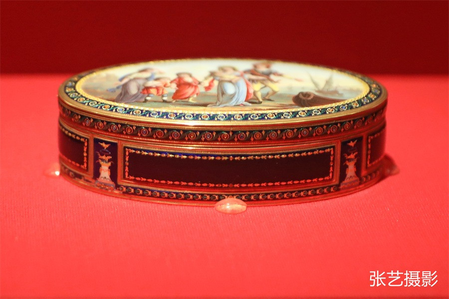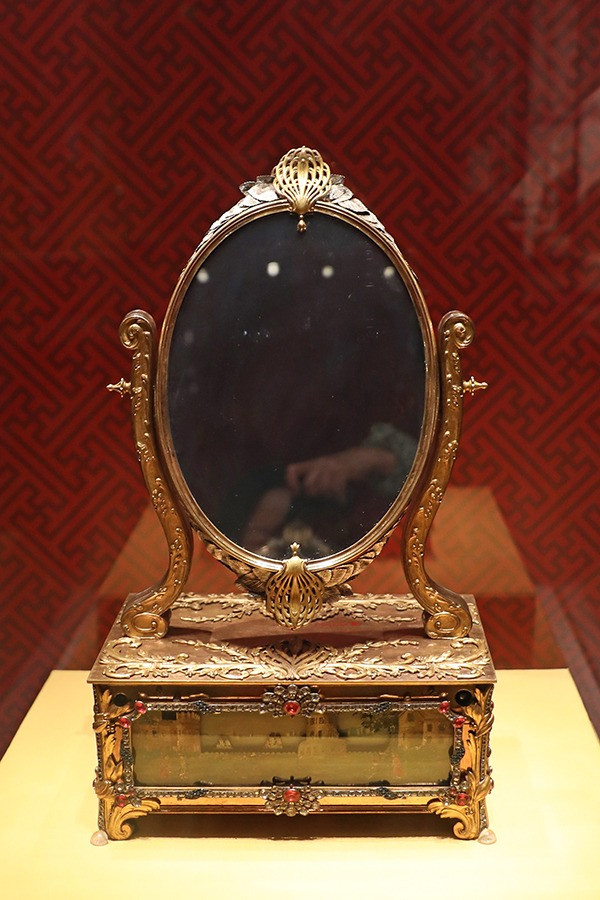 这是清宫旧藏英国18世纪镜子。容镜由底座和镜子两部分组成。底座前后两面描绘自然风光,船只、牛、马在其间移动。左侧面是音乐会场景,三位表演者分别拉大提琴、小提琴和演奏弹拨乐器;右侧面是马场景象,骑士牵马而来,有人汲水,有人钉马掌。镜子既是实用器,又是陈设品和观赏性玩具。上弦开动后,音乐响起,表演者胳膊移动作演奏状,汲水者、钉马掌者的胳膊移动好似正在劳作。