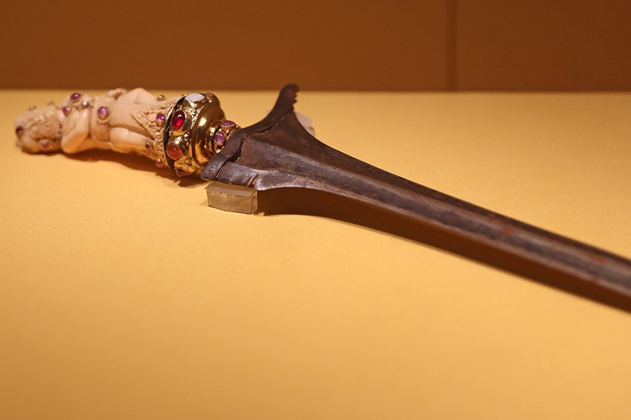 展馆展出的这把剑来自印度尼西亚,年代为20世纪。克力士剑的整体不对称,材质使用金银和象牙,手柄上刻划人物形象并镶嵌宝石,这是一把极为精美的克力士剑。对于当地人来说,克力士剑既是兵器也是仪仗用品,还有辟邪意义。克力士剑是是当地民族文化的代表。