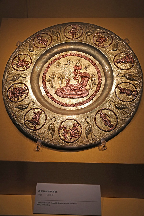 这是来自印度的铜盘,年代为20世纪。该铜盘硕大,刻花记载了印度神话故事。