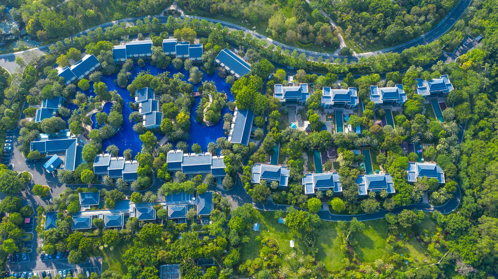 酒店占地100万平方米。山庄园林由国际大师专业设计,一步一景,有青山、峡谷、小桥、奇石、湖泊和草坪,共20000多棵乔木,更有400多种珍稀植物,俨然是一座“植物王国”。从海上航拍过去,依稀可见园林的宽阔,山海天层层递进,非常壮观。