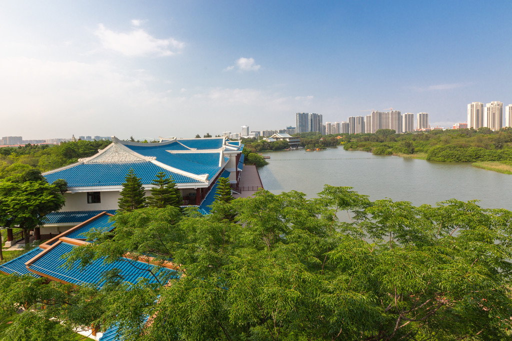 驱车前往酒店,穿过湿地公园,曲曲折折的路上,避开了热闹街市,邂逅4幢临湖而建的楼群,酒店外观采用了汉代宫殿式元素,以现代设计理念呈现中式建筑的美学灵韵,蓝瓦的歇山顶屋檐,映衬着白墙红柱,与生态园林、天鹅湖美景浑然一体。