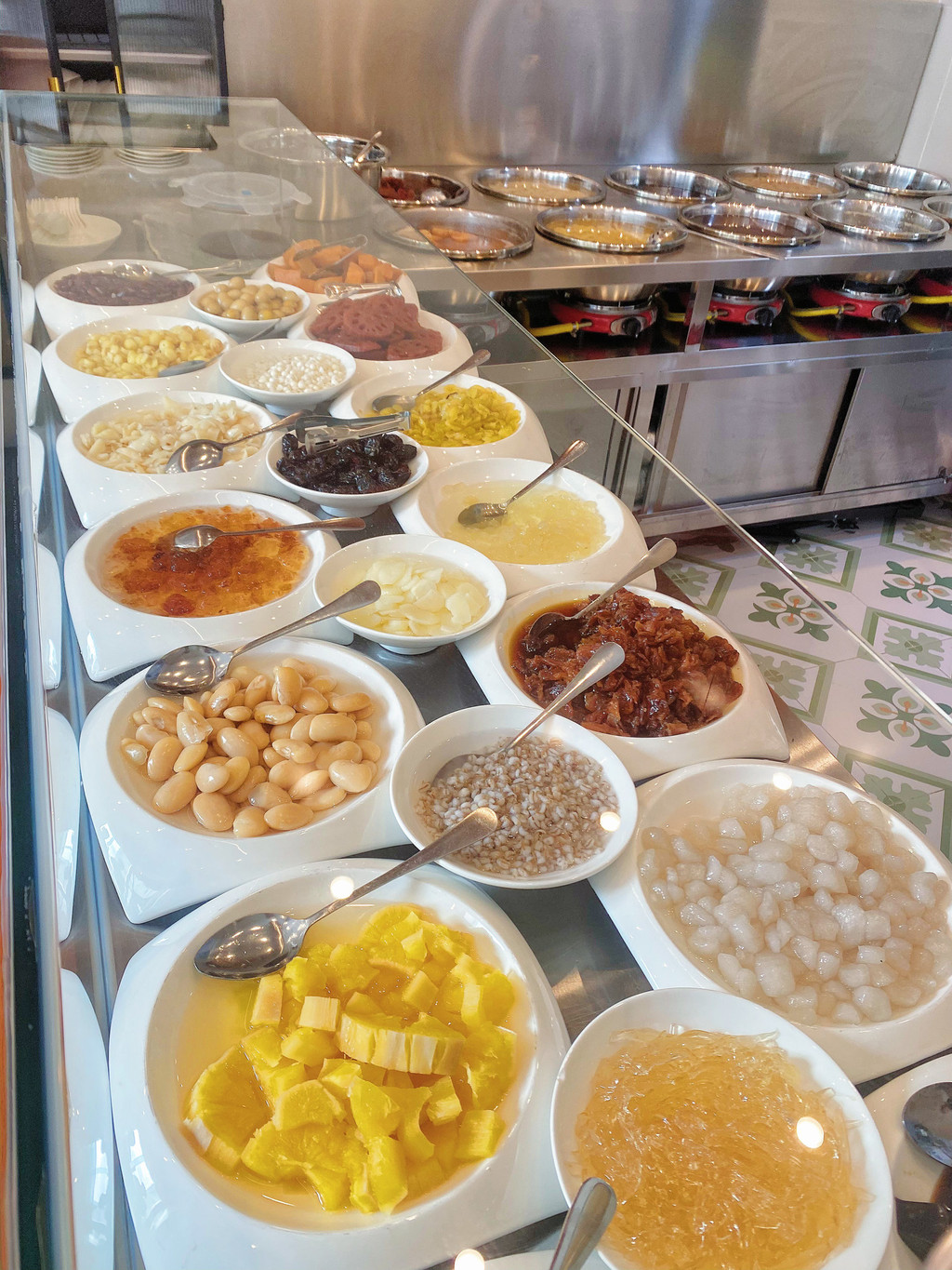 瞧一眼,品类也太多了吧。银杏果、芋头、龙眼干、燕麦、莲子、地瓜、红枣、百合、红糖莲藕、红糖鹌鹑蛋……还有其他店铺不常见的,白芸豆、蜜枣,薏仁、海石花、马蹄、木薯、皂角米、桃胶…两个台面满满当当,多达几十种,还分温的和冰的、全部区分开来。