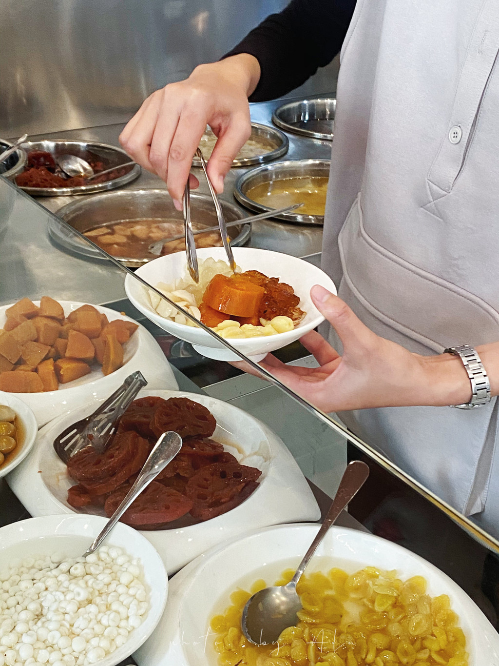 红糖莲藕是必点,它家的莲藕是厚切的,莲藕带着龙眼的甜香,吸满红糖味,刚刚好的半干状态,一看就是熬煮多时,脆,甜,好吃。香浓绵密的芋头,软而不烂,起沙的口感很是喜欢。红糖鹌鹑蛋,甜中带点微咸;白芸豆和芡实,经过泡、煮、洗,煮多重工序,银杏、莲子都煮得恰到好处;还有清脆的马蹄、滋补的桂圆肉、每款都有着不同的口感。