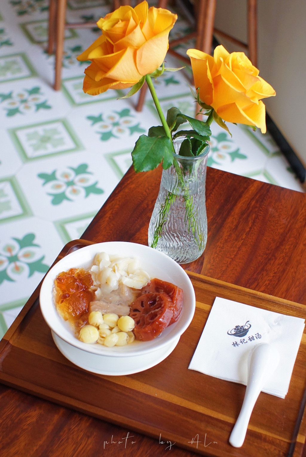店不大,复古的花砖,木质的桌子,有点儿古韵味,桌上插着鲜花,富有情调,靠着窗边的吧台座,还有室外露营桌子带着些许个性。