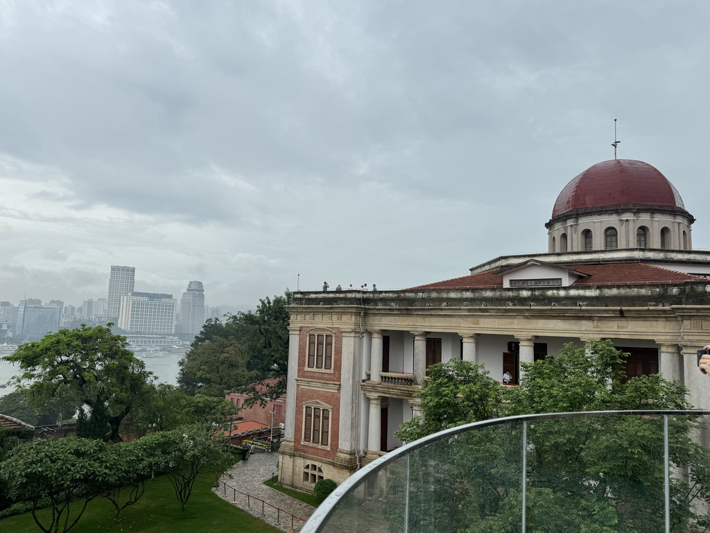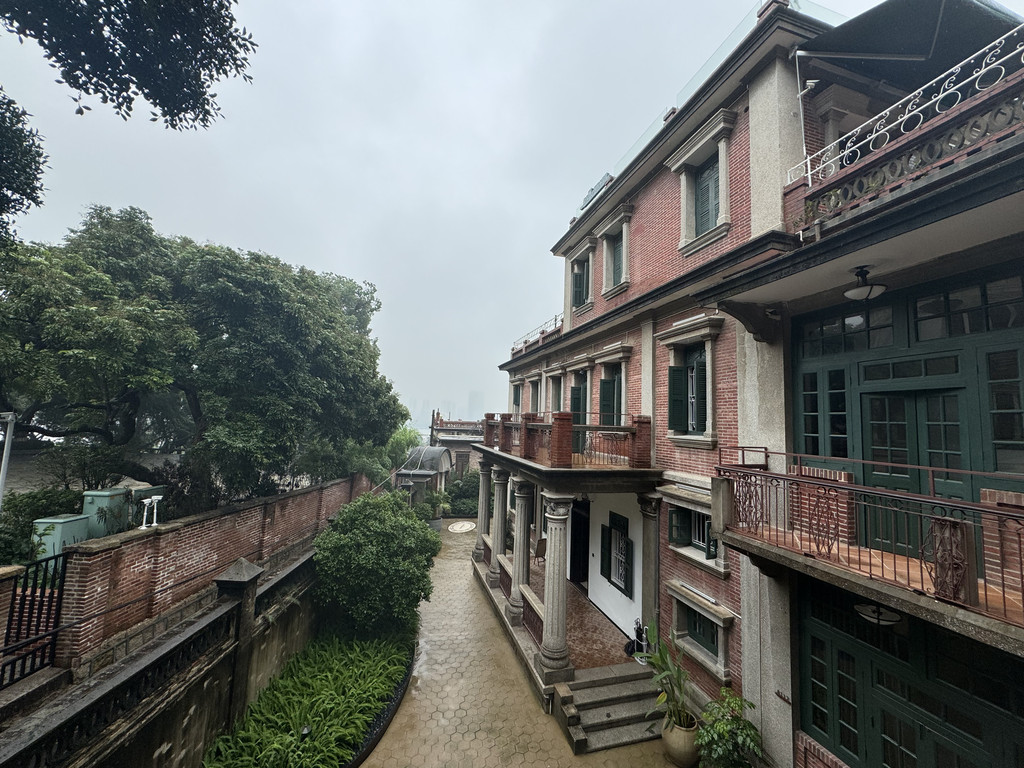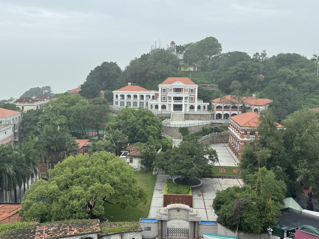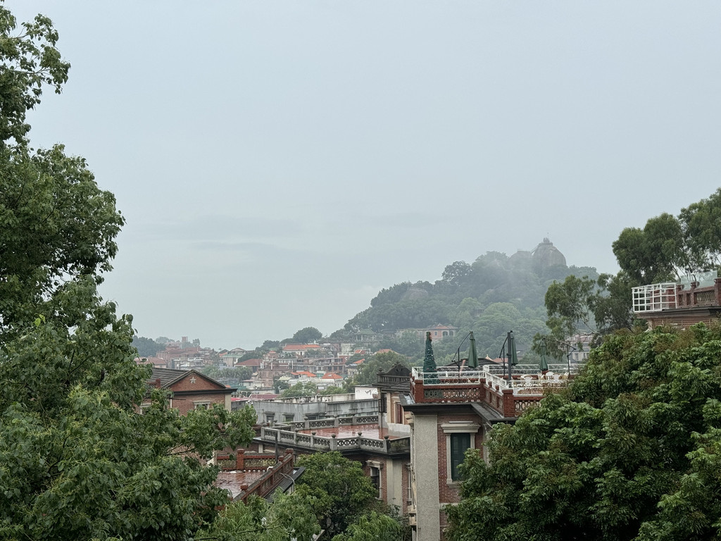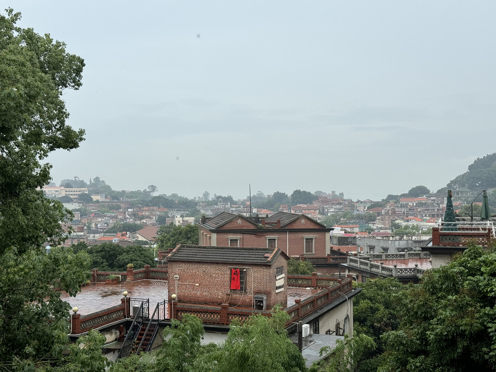 虽然雨天视线差强人意,但一座座红墙绿瓦的古宅散落在绿树丛中,远处海天一片迷雾,有点宁静致远的感觉。