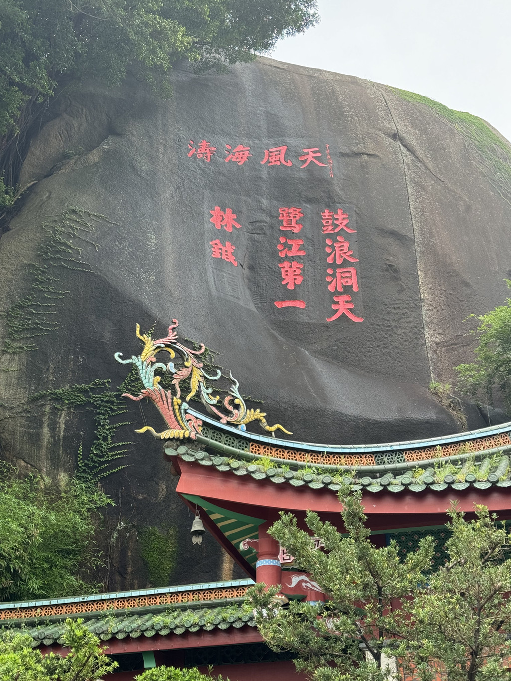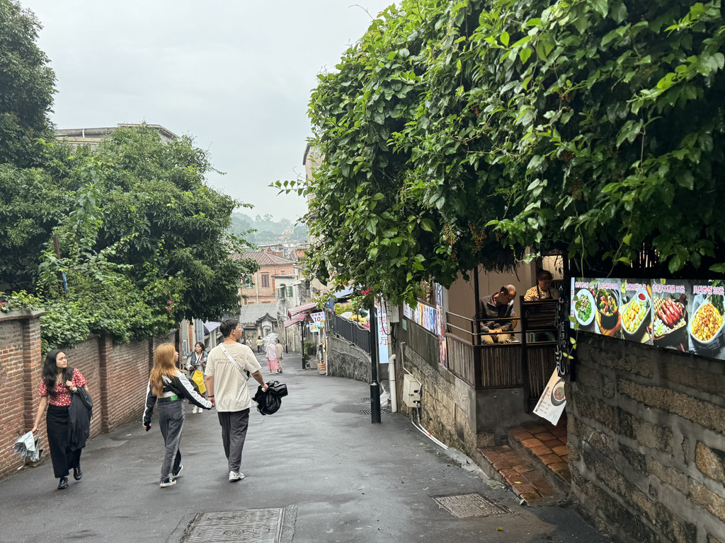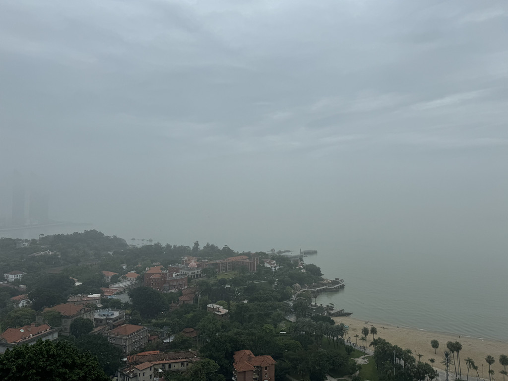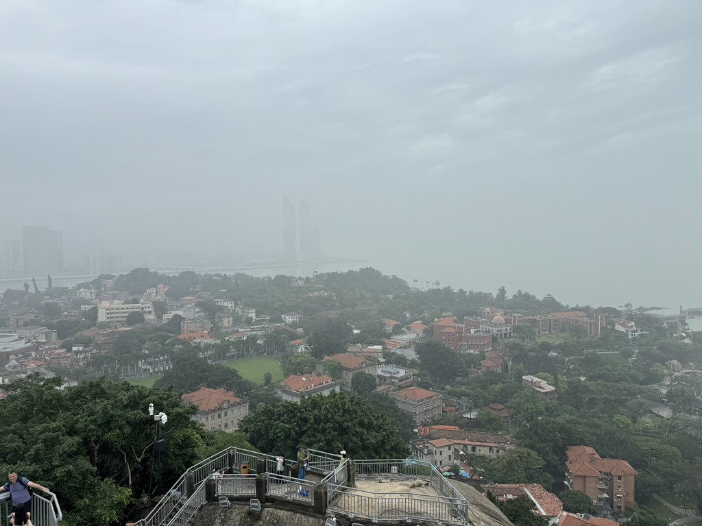 虽然雨天视线差强人意,但一座座红墙绿瓦的古宅散落在绿树丛中,远处海天一片迷雾,有点宁静致远的感觉。