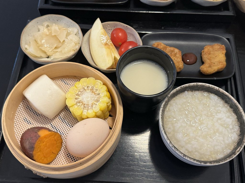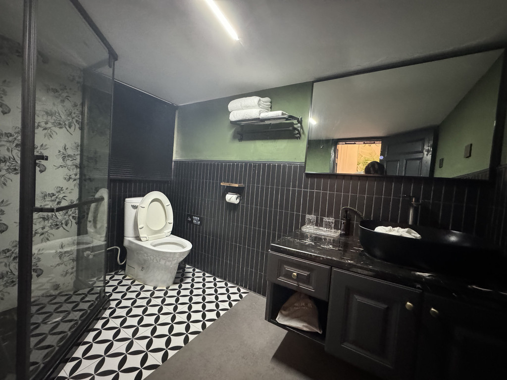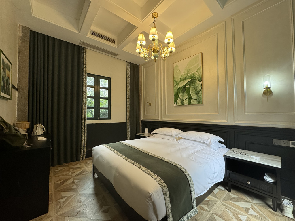 饮山至尊大床房,房间虽然小,胜在格调,很民国,缺点是小了点,连个坐的椅子都没有,更没有行李架,临时给我们搬来一把椅子,也接纳了我们优化的建议。